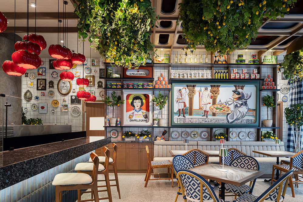 Los colores vibrantes, los murales pintados a mano con escenas clásicas italianas y la riqueza en elementos decorativos terminan de consolidar un espacio cargado de personalidad y calidez. Caruso no solo es un restaurante: es una historia contada a través del diseño, una memoria compartida en cada plato, en cada detalle.