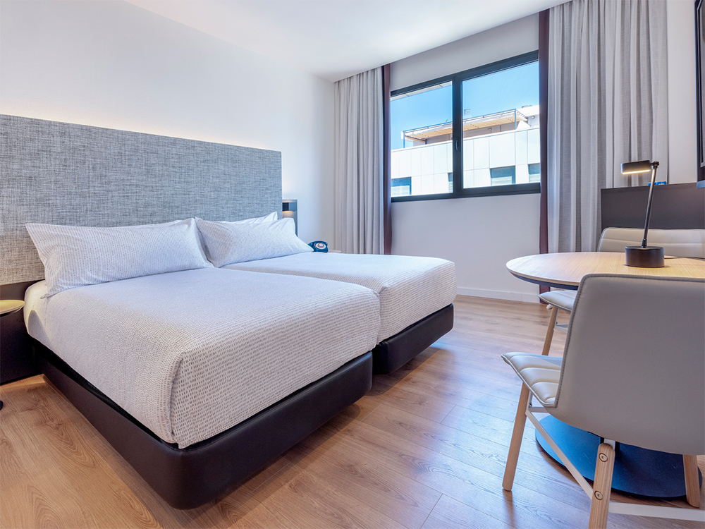 En las habitaciones, hay una apuesta decidida por una estética contenida, donde cada elemento parece ocupar su lugar de manera natural. Las líneas limpias del mobiliario, la presencia cálida de la madera y la luz que se cuela a través de las cortinas crean un ambiente contemporáneo que huye del exceso y apuesta por un equilibrio exquisito. Así, las cortinas siguen fielmente la marca Innside by Meliá, reforzando la identidad del hotel y aportando coherencia visual a todo el conjunto.