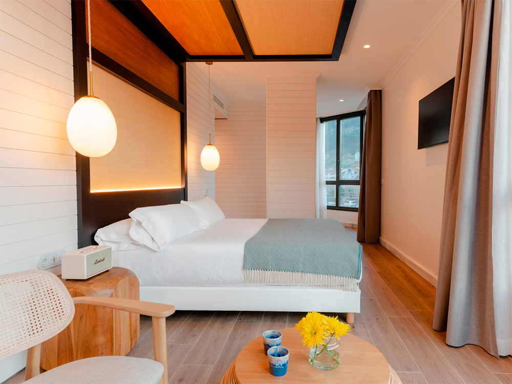 Frente al bravío Cantábrico, en la localidad de Deba, el Hiru Uhinak Hotel se levanta como una reinterpretación contemporánea del clásico hotel de playa. Un proyecto con identidad, inspirado en la leyenda vasca de las tres olas, en el que cada decisión de diseño responde a la idea de vincular paisaje, memoria y cultura local con una estética serena y depurada. En ese contexto, los textiles decorativos de Carmela Martí se han integrado con gran precisión, convirtiéndose en una parte esencial de la idiosincrasia del establecimiento.
