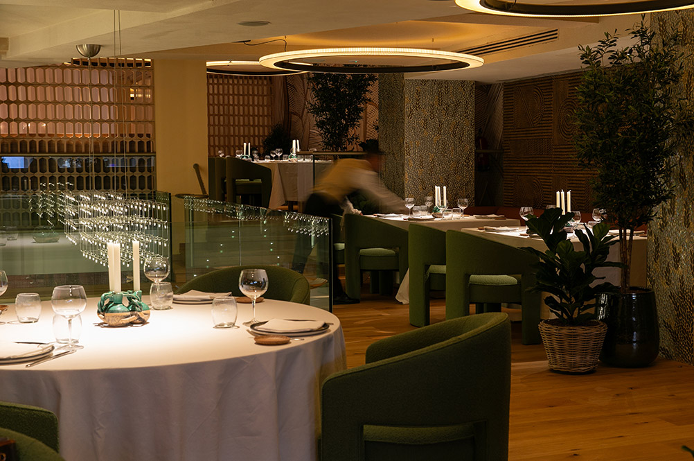Entre los detalles más especiales del restaurante, Fernández destaca “el trabajo realizado en los revestimientos murales, donde las geometrías orgánicas y los patrones de inspiración artesanal aportan identidad y carácter al espacio”. También cobran protagonismo los rincones definidos por la vegetación y los sutiles cambios de nivel o de iluminación, pensados, como explica, “para que el comensal descubra el restaurante poco a poco y cada visita revele algo nuevo”. Son detalles concebidos para que el espacio se perciba vivo, acogedor y en constante transformación.