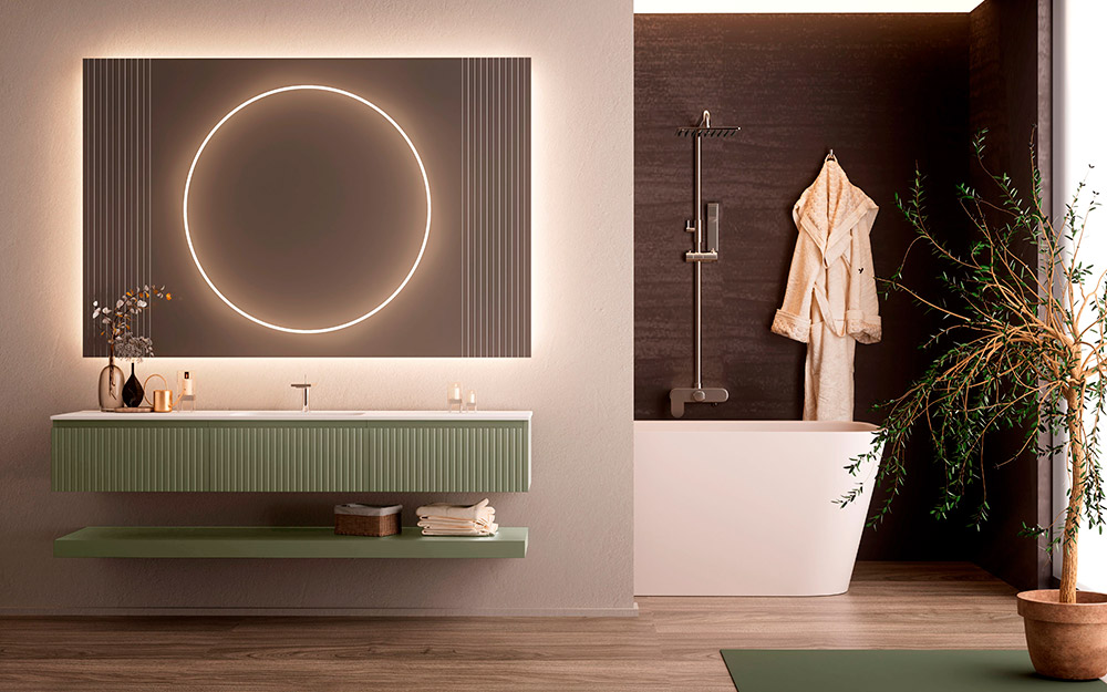 La línea se presenta en diversidad de formas —orgánicas, geométricas, redondeadas o asimétricas— alineadas con las tendencias actuales. Marcos sutiles o inexistentes, junto con retroiluminación perimetral y acabados de gran calidad, convierten cada espejo en un elemento decorativo.