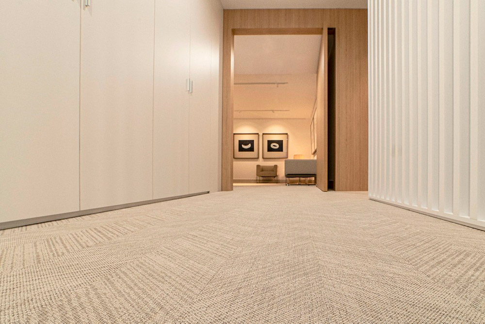 La intervención incorpora el modelo Strata Silica, un pavimento vinílico tejido que combina estética, sostenibilidad, confort y altas prestaciones técnicas para espacios de trabajo.