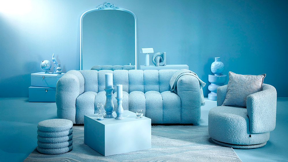 Este azul, relajante y atemporal, aporta profundidad a las materias suaves y reconfortantes de los textiles, al tiempo que realza con sutileza las formas de los accesorios decorativos. El resultado es una colección equilibrada y moderna, donde cada pieza contribuye a crear una atmósfera serena, luminosa y envolvente.