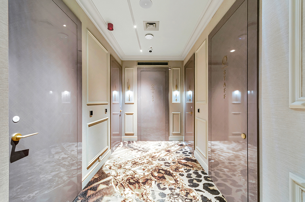 Probablemente, las puertas de las habitaciones son con las que el huésped está mayor contacto. Tienen que ser principalmente seguras, insonorizadas y resistentes al fuego (normalmente Ei30), garantizando privacidad y durabilidad. Deben contar con sistemas de cierre automático y apertura segura, con medidas estándar de al menos 80-90 cm de ancho y >2m de altura, integrándose estéticamente en el diseño del hotel.