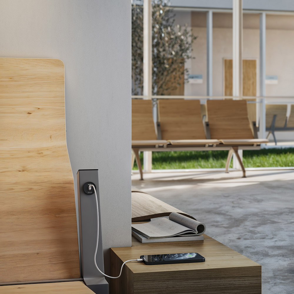 Con potencia de carga de hasta 100 W, kits precableados listos para instalar y un sistema antihumedad con drenaje, ofrece durabilidad, seguridad y facilidad de montaje. Su enfoque modular lo hace compatible con diferentes configuraciones y tipos de mobiliario, adaptándose a proyectos contract y residenciales con una instalación limpia y ágil.