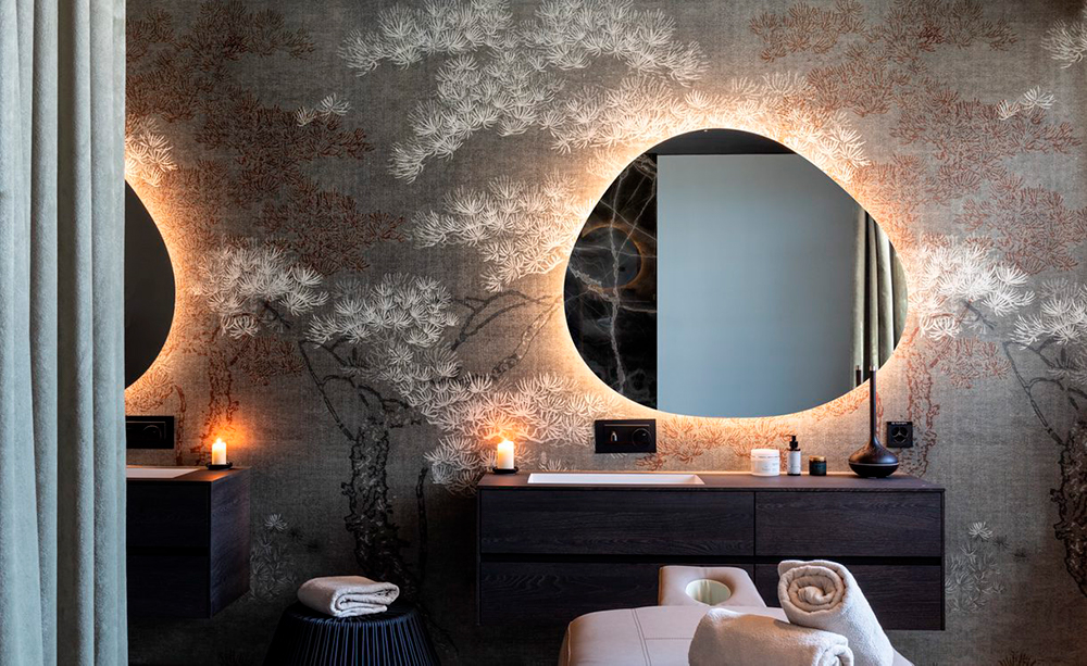 El spa se caracteriza por superficies envolventes en las que los motivos botánicos y las texturas materiales favorecen una inmediata sensación de tranquilidad.