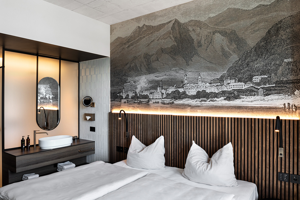 En algunas habitaciones, un gráfico panorámico de Locarno y las montañas circundantes se extiende sobre la cabecera de la cama como un relato visual.